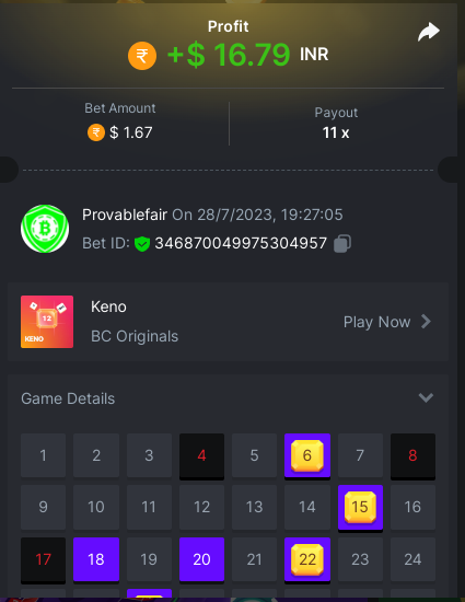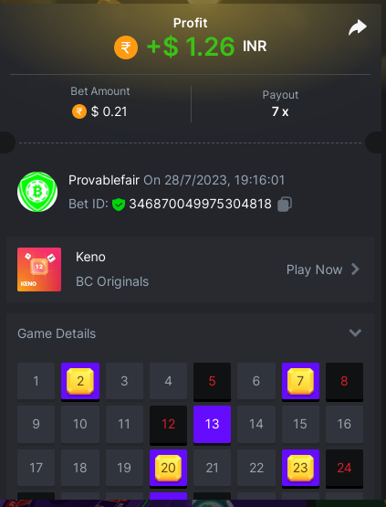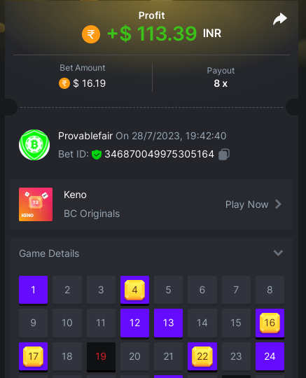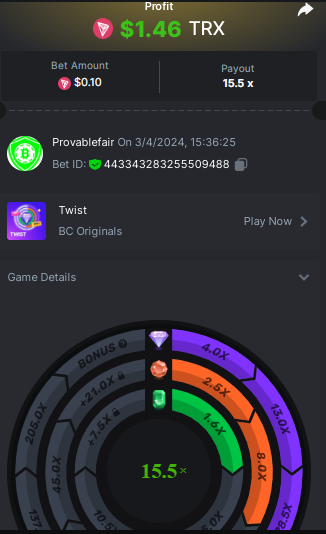 task done 17 out of 30 points Easy 1. Win a Crash bet with a 10x payout. Bet Amount 0.2$ - payout 10x - https://bc.game/#/sd/11W05LAVJ0XRDV - betid 1795325633233020674 2. Get a 10x payout on a Classic Dice bet. Bet amount 0.1$ - Bet ID: 9994389254345 - https://bc.game/#/sd/11W04DAUSPUQLN 3. Get a 10x payout on the Run Away Zumbies. Bet Amount 0.2$ - Payout 80.3106 x - https://bc.game/#/sd/11W0KIE8VXJPMF - Bet ID:1795339805452732712 4. Win a 'Tie' 9x bet on the Baccarat. - bet 0.12$ - https://bc.game/#/sd/11VZYA5O9WTSHN - Bet Id 443334654666211352 5. Get a 20x payout on the John Wild. Bet amount 0.1$ - payout 20.902x - https://bc.game/#/sd/11W0GYKZI9NE6F - Bet ID:1795337202902585386 6. Win a Twist bet on 15.5x payout (3rd Purple Gem). bet 0.1$- 15.5x - https://bc.game/#/sd/11W00W2HE7XUUZ - betid 443343283255509488 7. Win a Sports bet with minimum odds being 1.5x (singles only) 2$ base min amount. Ticket Id 2386880115666727018 - odds 1.871x bet 100 tron (11$+) - 8. Get a minimum 20x multi on BGaming Hello Easter slot. Bet Amount 0.18$ - Payout 22.2271 x - https://bc.game/#/sd/11W0M2A9IMSF3V - Bet ID:1795342327546256169 9. Get a minimum 30x multi on Red Tiger Lucky Easter slot. Bet Amount 0.1$ - Payout 103.7037 x-https://bc.game/#/sd/11W0T1253QL30F - Bet ID: 1795349432350376490 10. 2FA enabled , E-Mail & Phone Number verified. Medium 1. Win a bet in Roulette Single with betting on 0 only (36x). (no spread bets) Bet Amount 0.1$ - payout 36x - https://bc.game/#/sd/11W0G3KI2UCN0B - Bet ID:160147613797056952 2. Get a 76x on Plinko. Bet Amount 0.1$ - Payout 76x -https://bc.game/#/sd/11W0FBW34H0ZNF - Bet ID:138896824286067710 4 Win a Sports bet with minimum odds of 2x (singles only) 2$ base min amount. Ticket Id 2386880698159079982 - odds 2.21x bet 45 tron (5$+) - 8. Get a minimum 90x multi on BGaming Easter Heist slot. Bet Amount $0.10 - Payout 136.1364x - https://bc.game/#/sd/11W2937HDYZ1R7- Bet ID:1795402318880305961 Hard 1. Get a 29.70x on Wheel (30 segments, High risk). Bet Amount 0.1$ - Payout 29.7x - https://bc.game/#/sd/11W01J42QJW7EV Bet ID: 443346852373331982 2. Get a 420x on Plinko (14 rows, High risk). Bet Amount 0.1$ - Payout 420x - https://bc.game/#/sd/11W0CA75CTHUGR - Bet ID: 138896824286066571 7. Win a bet on Keno Single by selecting numbers 10, 11, 12 and 13, High risk, (259.00x). Bet Amount 0.1$ - payout 259x - https://bc.game/#/sd/11W08UETLZH4BV - BetID :346870049975306801 -