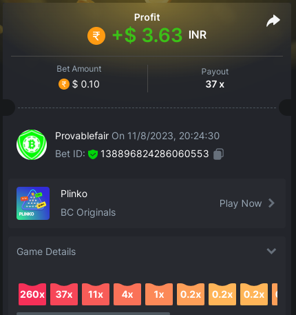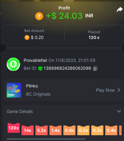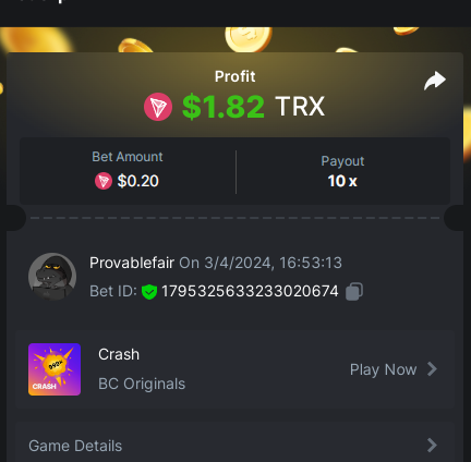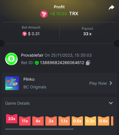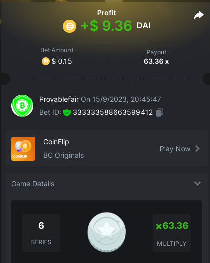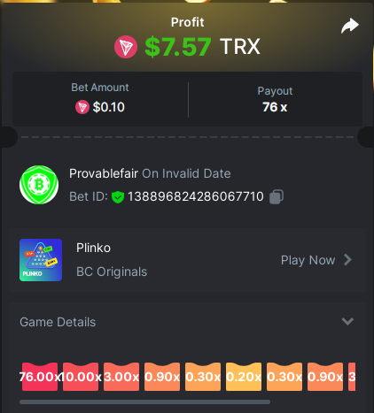 9x 0.32 https://bc.game/#/sd/11EBVJLUGH5GCZ Bet ID:327907009154254740 ----- 12x 0.32$ https://bc.game/#/sd/11EBVNY5LHXTGN Bet ID:327907009154254739 -- 15.5x https://bc.game/#/sd/11EBNUJIV3VEXZ Bet ID: 327907009154252993 ---- 16.5x 0.32$ https://bc.game/#/sd/11EBVQRMJB3NRN Bet ID:327907009154254742 -