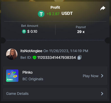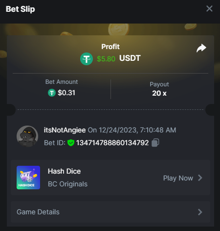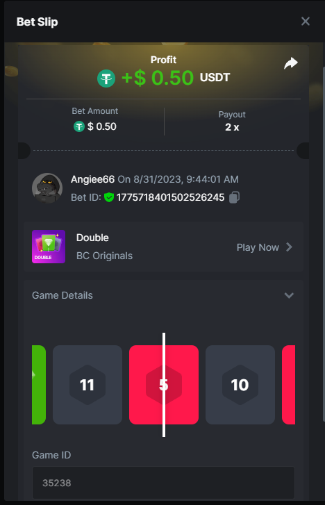3. 12* Consecutive Bets on same color: Game Id: 35230 to Game Id: 35241 Game Id: 35230: https://bc.game/#/sd/11H3WD07T5A48J Game Id: 35231: https://bc.game/#/sd/11H3WDHGARE797 Game Id: 35232: https://bc.game/#/sd/11H3WDVEWXA7EB Game Id: 35233: https://bc.game/#/sd/11H3WE8GKWTM3B Game Id: 35234: https://bc.game/#/sd/11H3WEQHZ17GMR Game Id: 35235: https://bc.game/#/sd/11H3WEXMHDYKVV Game Id: 35236: https://bc.game/#/sd/11H3WFGIGOX6IJ Game Id: 35237: https://bc.game/#/sd/11H3WFX8SJO3YV Game Id: 35238: https://bc.game/#/sd/11H3WG70JBRL8B Game Id: 35239: https://bc.game/#/sd/11H3WIE373WWS3 Game Id: 35240: https://bc.game/#/sd/11H3WHUN84F8ZF Game Id: 35241: https://bc.game/#/sd/11H3WHBEV58D1Z Note: There are few people who are changing the seed/placing multiple bet on single seed thats why they have like alot of consecutive bets, i havent not changed the seed as it is mentioned clearly in the challenge requirements