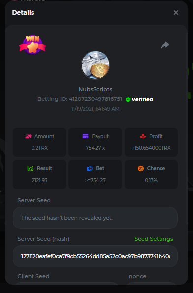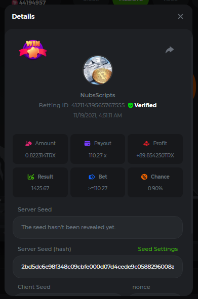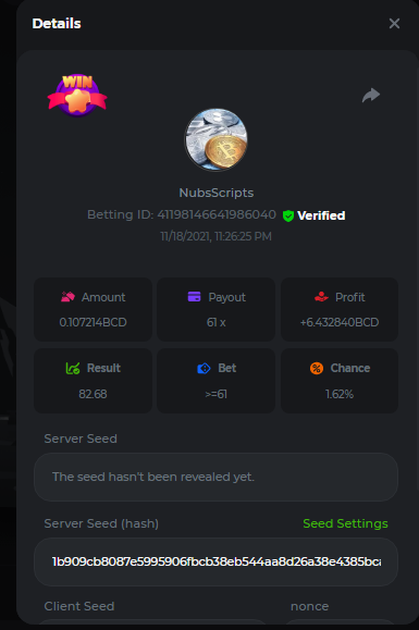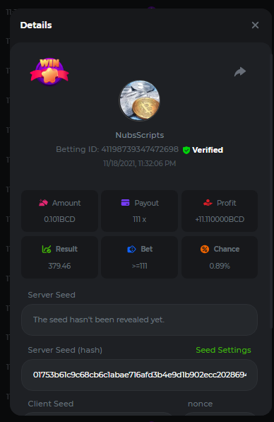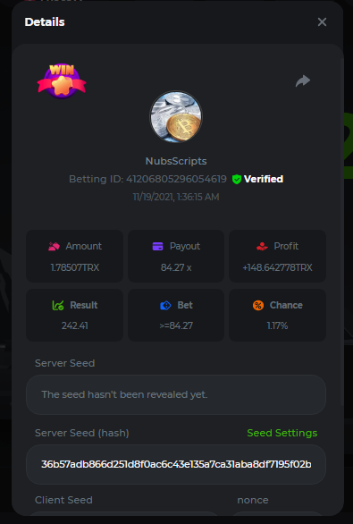 Yes this thread is a little old but hopefully you all are still around. I'm going to post a script from 3 years ago. I'm pretty sure the responses from server have changed so it won't run. However, this script will change the payout based upon the board. At one point it ran on ng for almost 30 days straight without interruption. Documented and posted screenshots along the way. Started with free 0.005 Eth from spider back then and got it up to 0.89 Eth and then I got scared and shut it down. //******************* Nubs27's Smart Script for Crash ******************* // // // // If you find this script helpful please consider donating to Nubs27 or tipping on NanoGames.io: // Referral Link: https://n-luzqe.nanogames.io/ // // Donations accepted in many coin/token types. List & Addresses: // https://sites.google.com/view/nanogamescrashscripts/home/donation-addresses // // // var config = { mainTitle: { label: '*** Nubs27\'s Smart Script for Crash ***', type: 'title' }, auto: { label: '', value: 'Script', type: 'radio', options: [ { value: 'Script', label: 'Script chooses Base Bet'}, { value: 'Player', label: 'Player chooses Base Bet'} ]}, bet: { label: 'Base Bet', value: currency.minAmount, type: 'number' }, lossTitle: { label: 'Stop When ', type: 'title' }, stop: { label: 'Coins Lost >', value: 1, type: 'number' }, end: { label: 'Minutes >', value: 250, type: 'number' }, profit: { label: 'Profit >', value: 100, type: 'number' }, }; function main () { //PayOuts checked in the Stats Update const MultiplierArray = [2.5, 3.00, 5.00, 6.00, 7.00]; const LMultiplierArray = [10.00, 20.00, 50.00, 100.00]; var version = "v2.3"; var PayOutPercents = []; var PayOutConfidence = []; var Array2Filter = []; var FilteredArray = []; var ScriptHistory = []; var Trains = []; // Red Train IDs - finding gaps between & correlation between gap & duration var History = []; var RoundsPlayed = 0; var RoundsViewed = 0; var LastGameID = 1; var CurrentGameID = LastGameID + 1; var MinimumBet = currency.minAmount; var MaxBet = (currency.amount / 10); var TotalBets = 0; var CurrentMultiplier = MultiplierArray[1]; var LastMultiplier = MultiplierArray[1]; var MaxLossesEncountered = 3; var MostLost = 0; var LargestMulitplier = 2; var BaseBet = config.bet.value; var CurrentBet = BaseBet; var LastBet = BaseBet; var LastShrek = CurrentGameID; var LastTrain = 0; var Gap = 0; var AverageGap = 0; var LargestBet = [0,0]; var Enable100ID = 1000000; var LastResult = "Won"; var CoinLost = 0; var StopLossCoin = config.stop.value; var Losses = 0; var Wins = 0; var Red = 0; var Green = 0; var StartTime = new Date(); var EndTime = new Date(); var TimeDiff = (EndTime - StartTime); var StartBalance = currency.amount; var EndBalance = 0; var Profit = 0; var ATHProfit = 0; var ProfPerMin = 0; var NetProfit = 0; var DisplayGreeting = "False"; var GotHistory = "False"; var BetYet = "False"; var LoggedBetData = "False"; var GameInfoLogged = "False"; var StrategyFound = "False"; var IsPlaying = "False"; var UpdateBets = "False"; var Enable100 = "False"; var LastCrash = 0; var PrevCashOut = 0; var WonAmount = 0; var FindThisMultiplier = 1; var FindShouldHave = 2; var ThisAverage = 1; var HistorySlice = 50; var Paused = "True"; var IndexMax = PayOutConfidence[0]; var MaxIndex = 0; var GetNumber = 0; // Welcome the Player to the Script console.clear(); engine.on('GAME_STARTING', function () { if (DisplayGreeting == "False") { log.info(' Nubs27s Smart Script for Crash'); log.info(" ****************"); log.info("See Web Console for more Information (Press F12)"); console.log('%c~~~~~~~~~~~~~~~~~ Nubs27\'s Smart Script for Crash ~~~~~~~~~~~~~~~~~','color:Purple; font-weight:bold'); console.log('%cScript Start Time: ' + StartTime,'color:Purple; font-weight:200'); console.log(' %cWelcome ' , 'color:Purple; font-weight:bold'); console.log(' %cYour Starting Balance is: ' + StartBalance + ' ' + currency.currencyName, 'color:Purple; font-weight:bold'); if (config.auto.value == 'Player') { if (config.stop.value > currency.amount) { MaxBet = (currency.amount / 10); config.stop.value = currency.amount * 0.98; console.log('%c[WARNING]: Stop Loss is above your Bankroll','color:Orange; font-weight:bold'); console.log('%c[WARNING]: Stop Loss Updated to ' + config.stop.value, 'color:Orange; font-weight:bold'); } if (config.bet.value > (config.stop.value / 15000)) { log.info('[WARNING]: Script Recommends a bankroll of at least ' + (BaseBet * 15000) + '' + currency.currencyName + ' for the Base Bet you provided'); log.info('[WARNING]: Script Recommends a bankroll of at least ' + (BaseBet * 20000) + '' + currency.currencyName + ' for the Base Bet you provided'); log.info('[WARNING]: Script Recommends a bankroll of at least ' + (BaseBet * 25000) + '' + currency.currencyName + ' for the Base Bet you provided'); } console.log(' %cYou Input: ' + BaseBet + ' ' + currency.currencyName + ' as the Base Bet', 'color:Purple; font-weight:bold'); }else{ betupdate(); console.log(' %cYour Starting Base Bet is: ' + BaseBet + ' ' + currency.currencyName, 'color:Purple; font-weight:bold'); } console.log(' %cYour Stoppers are: Coin Lost > ' + config.stop.value + '; Minutes > ' + config.end.value + '; Profit > ' + config.profit.value, 'color:Purple; font-weight:bold'); console.log('%c~~~~~~~~~~~~~~~~~~~~~~~~~~~~~~~~~~~~~~~~~~~~~~~~~~~~~~~~~~~~~~~~~~','color:Purple; font-weight:bold'); if (config.stop.value > currency.amount) { MaxBet = (currency.amount / 10); config.stop.value = currency.amount * 0.95; console.log('%c[WARNING]: Stop Loss Updated to ' + config.stop.value, 'color:Orange; font-weight:bold'); } } DisplayGreeting = "True"; if (GotHistory == "False") { getnanohistory(); GotHistory = "True"; console.log(ScriptHistory); LastShrek = []; LastTrain = []; } // // // //Everything above here only runs 1 time console.log(' ----------------------------'); CurrentGameID = (LastGameID + 1); console.log('[Round ID]: ' + CurrentGameID); if (StrategyFound == "False") { strategy(); } //Checks Us