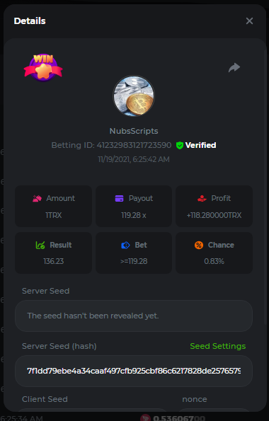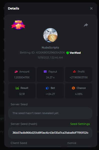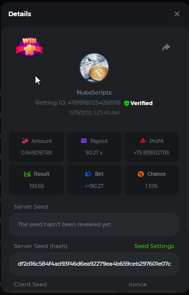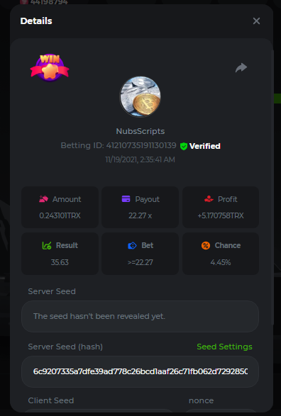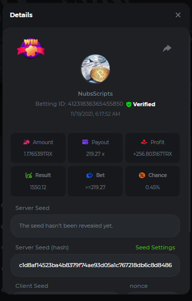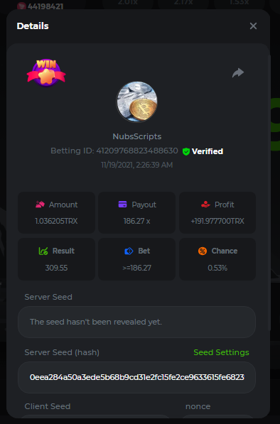 The get history has always loaded the previous 20 rolls. The only way to load more is to get from verification site which is beyond me. It grabs those 20 previous rolls because that's 20 more than just pressing Start and we want to see some sort of pattern before betting. It now adjusts the bet according to losses. The Update won't show correct Profit as the ability to call the currency.amount returns the same amount as when the script 1st started. To me this is old and spaghetti looking with crap all over it. This style of betting based upon losses generates a certain level of profit, but is not even close to basing bets on the Streaks % and pausing betting when no streaks. //******************* Nubs27's Smart Script for Crash ******************* // // // // If you find this script helpful please consider donating to Nubs27 or tipping on NanoGames.io: // Referral Link: https://n-luzqe.nanogames.io/ // // Donations accepted in many coin/token types. List & Addresses: // https://sites.google.com/view/nanogamescrashscripts/home/donation-addresses // // // var config = { mainTitle: { label: '*** Nubs27\'s Smart Script for Crash ***', type: 'title' }, auto: { label: '', value: 'Script', type: 'radio', options: [ { value: 'Script', label: 'Script chooses Base Bet'}, { value: 'Player', label: 'Player chooses Base Bet'} ]}, bet: { label: 'Base Bet', value: currency.minAmount, type: 'number' }, lossTitle: { label: 'Stop When ', type: 'title' }, stop: { label: 'Coins Lost >', value: 1, type: 'number' }, end: { label: 'Minutes >', value: 250, type: 'number' }, profit: { label: 'Profit >', value: 100, type: 'number' }, }; function main () { //PayOuts checked in the Stats Update const MultiplierArray = [2.5, 3.00, 5.00, 6.00, 7.00]; const LMultiplierArray = [10.00, 20.00, 50.00, 100.00]; var version = "v2.3"; var PayOutPercents = []; var PayOutConfidence = []; var Array2Filter = []; var FilteredArray = []; var ScriptHistory = []; var Trains = []; // Red Train IDs - finding gaps between & correlation between gap & duration var History = []; var RoundsPlayed = 0; var RoundsViewed = 0; var LastGameID = 1; var CurrentGameID = LastGameID + 1; var MinimumBet = currency.minAmount; var MaxBet = (currency.amount / 10); var TotalBets = 0; var CurrentMultiplier = MultiplierArray[1]; var LastMultiplier = MultiplierArray[1]; var MaxLossesEncountered = 3; var MostLost = 0; var LargestMulitplier = 2; var BaseBet = config.bet.value; var CurrentBet = BaseBet; var LastBet = BaseBet; var LastShrek = CurrentGameID; var LastTrain = 0; var Gap = 0; var AverageGap = 0; var LargestBet = [0,0]; var Enable100ID = 1000000; var LastResult = "Won"; var CoinLost = 0; var StopLossCoin = config.stop.value; var Losses = 0; var Wins = 0; var Red = 0; var Green = 0; var StartTime = new Date(); var EndTime = new Date(); var TimeDiff = (EndTime - StartTime); var StartBalance = currency.amount; var EndBalance = 0; var Profit = 0; var ATHProfit = 0; var ProfPerMin = 0; var NetProfit = 0; var DisplayGreeting = "False"; var GotHistory = "False"; var BetYet = "False"; var LoggedBetData = "False"; var GameInfoLogged = "False"; var StrategyFound = "False"; var IsPlaying = "False"; var UpdateBets = "False"; var Enable100 = "False"; var LastCrash = 0; var PrevCashOut = 0; var WonAmount = 0; var FindThisMultiplier = 1; var FindShouldHave = 2; var ThisAverage = 1; var HistorySlice = 50; var Paused = "True"; var IndexMax = PayOutConfidence[0]; var MaxIndex = 0; var GetNumber = 0; // Welcome the Player to the Script console.clear(); engine.on('GAME_STARTING', function () { if (DisplayGreeting == "False") { log.info(' Nubs27s Smart Script for Crash'); log.info(" ****************"); log.info("See Web Console for more Information (Press F12)"); console.log('%c~~~~~~~~~~~~~~~~~ Nubs27\'s Smart Script for Crash ~~~~~~~~~~~~~~~~~','color:Purple; font-weight:bold'); console.log('%cScript Start Time: ' + StartTime,'color:Purple; font-weight:200'); console.log(' %cWelcome ' , 'color:Purple; font-weight:bold'); console.log(' %cYour Starting Balance is: ' + StartBalance + ' ' + currency.currencyName, 'color:Purple; font-weight:bold'); if (config.auto.value == 'Player') { if (config.stop.value > currency.amount) { MaxBet = (currency.amount / 10); config.stop.value = currency.amount * 0.98; console.log('%c[WARNING]: Stop Loss is above your Bankroll','color:Orange; font-weight:bold'); console.log('%c[WARNING]: Stop Loss Updated to ' + config.stop.value, 'color:Orange; font-weight:bold'); } if (config.bet.value > (config.stop.value / 15000)) { log.info('[WARNING]: Script Recommends a bankroll of at least ' + (BaseBet * 15000) + '' + currency.currencyName + ' for the Base Bet you provided'); log.info('[WARNING]: Script Recommends a bankroll of at least ' + (BaseBet * 20000) + '' + currency.currencyName + ' for the Base Bet you provided'); log.info('[WARNING]: Script Recommends a bankroll of at least ' + (BaseBet * 25000) + '' + currency.currencyName + ' for the Base Bet you provided'); } console.log(' %cYou Input: ' + BaseBet + ' ' + currency.currencyName + ' as the Base Bet', 'color:Purple; font-weight:bold'); }else{ betupdate(); console.log(' %cYour Starting Base Bet is: ' + BaseBet + ' ' + currency.currencyName, 'color:Purple; font-weight:bold'); } console.log(' %cYour Stoppers are: Coin Lost > ' + config.stop.value + '; Minutes > ' + config.end.value + '; Profit > ' + config.profit.value, 'color:Purple; font-weight:bold'); console.log('%c~~~~~~~~~~~~~~~~~~~~~~~~~~~~~~~~~~~~~~~~~~~~~~~~~~~~~~~~~~~~~~~~~~','color:Purple; font-weight:bold'); if (config.stop.value > currency.amount) { MaxBet = (currency.amount / 10); config.stop.value = currency.amount * 0.95; console.log('%c[WARNING]: Stop Loss Updated to ' + config.stop.value, 'color:Orange; font-weight:bold'); } } DisplayGreeting = "True"; if (GotHistory == "False") { getnanohistory(); GotHistory = "True"; console.log(ScriptHistory); LastShrek = []; LastTrain = []; } // // // //Everything above here only runs 1