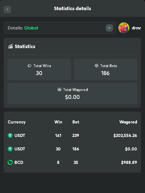 6. Hey @Liquidwalker we just did a brief check on UID: 65958920 on your request! He’s a sports bettor! Sports wagers don’t reflect in the main profile wager counter (casino only), which is why you see “$0” there. Checking Statistics > Details shows the real picture: 239 bets in USDT $202,556+ wagered So his raffle entry is fully valid. He is doing well! He is already rocking a 10k Profit Medal 'Chicken Dinner' while some of us are still grinding for years.