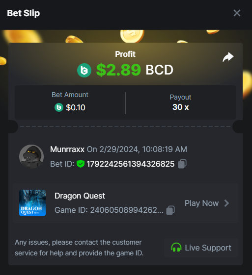 1. HARD 6. Limbo game is your target to win 200x or higher. https://bc.game/game-detail/1827307434501201443 1. Win on Wheel 48x or higher - Row 50, Segment High. https://bc.game/game-detail/1827312844856712226 Medium 1. Deposit At least $100 USD ID order: A-1827314325195331211 Txid: e697040c85293ef8ca2a8c32649fb68f7656cdb9244fd779d4c1b0616811a910 3. Get a payout of 73.6x on the original Plinko game Risk-High, Row-10. https://bc.game/game-detail/1827313990919787298 10. Buy at least 30 BC Lottery tickets using $BC Token. -or- Buy at least 2 BC Porsche lottery tickets using $BC Token send screenshot in forum post. 11. Win a sports parlay/combo bet with at least 3 matches and a 2.5x minimum payout to qualify. Ticket ID: 2515967632226787902 Easy 1. Deposit At least $50 USD ID order: A-1827314325195331211 Txid: e697040c85293ef8ca2a8c32649fb68f7656cdb9244fd779d4c1b0616811a910 2. Follow BC.GAME on Instagram, take a screenshot, and share it with your IG username in the forum! @yofreclavijo 4. Follow BC.GAME Twitter Take a screenshot of the following and include your Twitter username in the forum. @Mun11643102 5. Like and Retweet BC.GAME's latest post and tag at least 3 of your friends. Take a screenshot and include your Twitter username in the forum. @Mun11643102 6. Follow BC.GAME Facebook. Take a screenshot of the following and include your FB username in the forum. https://www.facebook.com/yofreclavijo/ 7. Win a payout of 20x on the original Limbo game. https://bc.game/game-detail/1827344509511945506 8. Win a Sports bet with a minimum payout of 1.5x odds (Only for single bets). Ticket ID: 2515280450730209380 9. Get a 20x multi in the Arabian Secret slot game. https://bc.game/game-detail/1827346561720961313 11. Activate 2FA security on your BC.Game account. Take a screenshot of 2FA and keep it active till the result is announced.