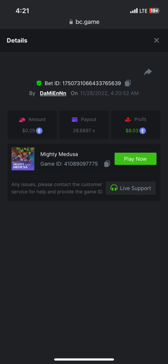 22. Mighty medusa https://bc.game/#/sd/10Y4FZ4C93OAOJ 28.6897x $0.30 bet