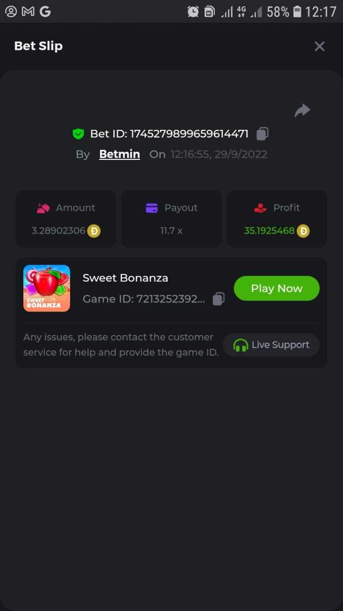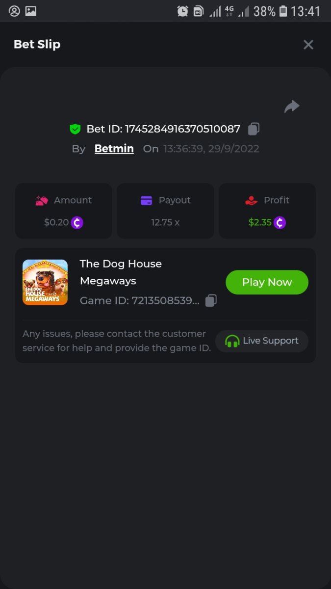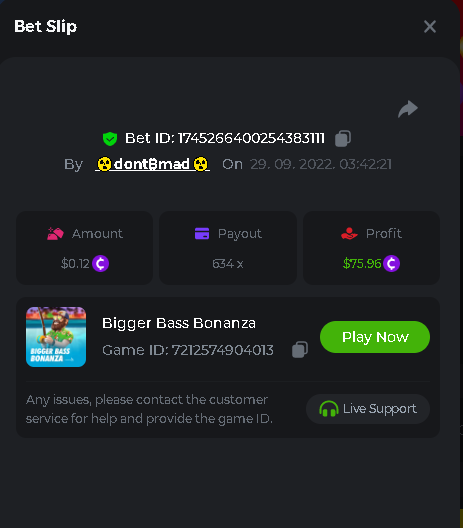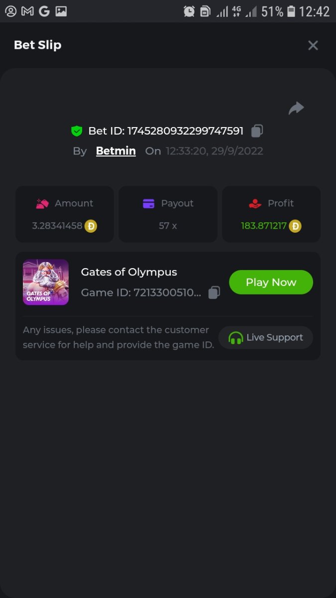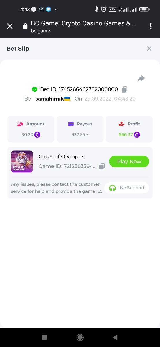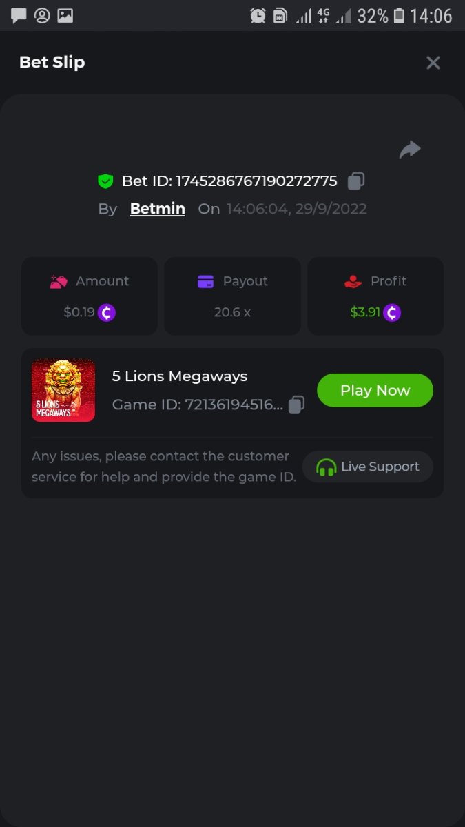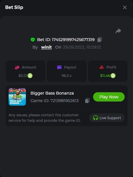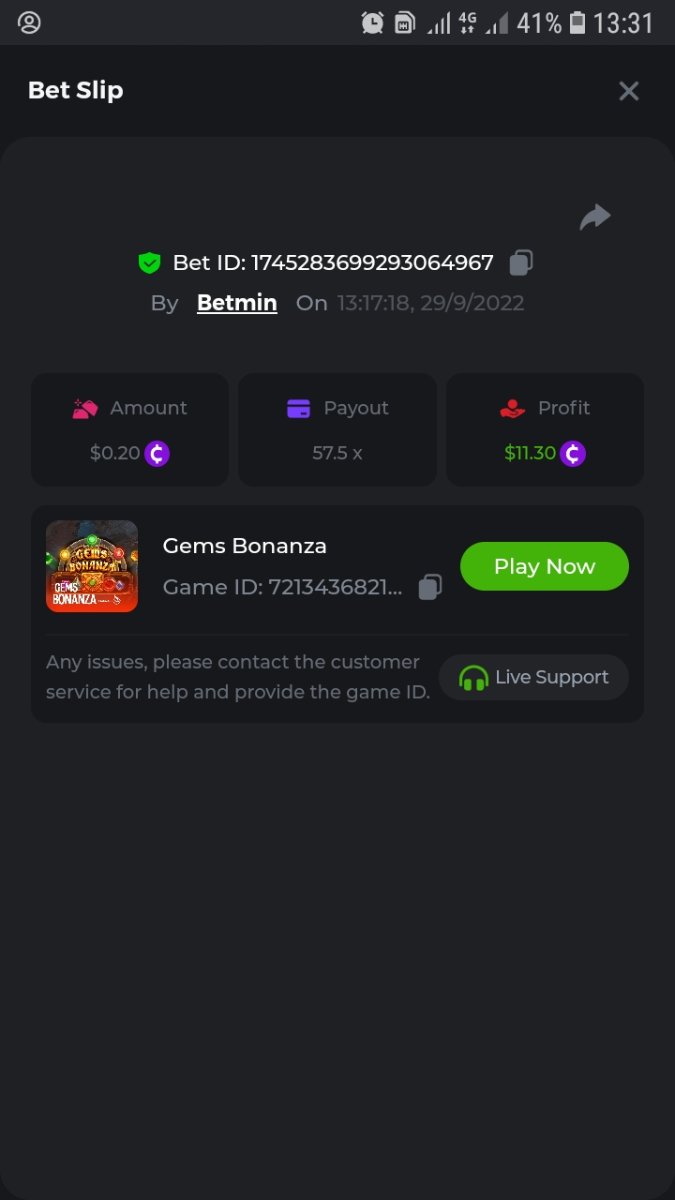 • 같은 게시물 에서 게임 ID WITH VIEW IN USD mode ENABLED를 클릭하여 승리 스크린샷을 업로드합니다 . 내기는 실제로 배치 당시의 최소 요구 사항을 충족했습니다.
