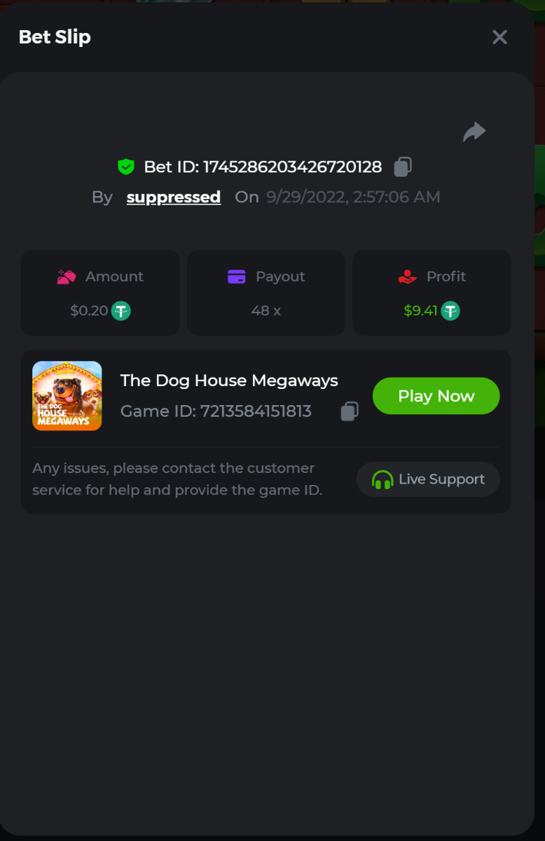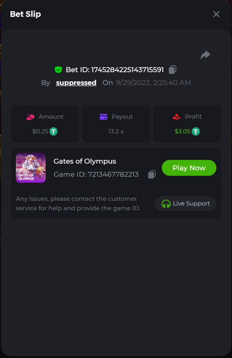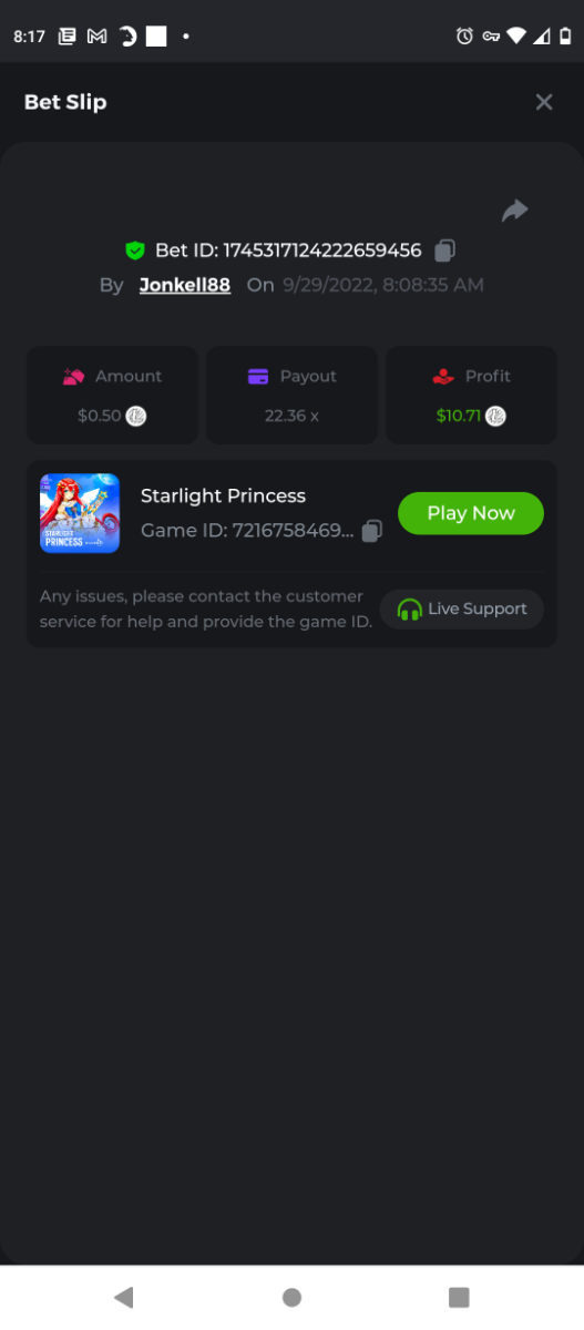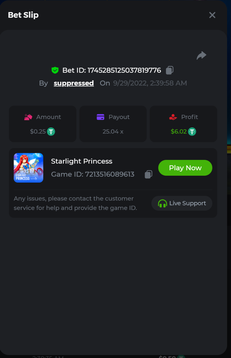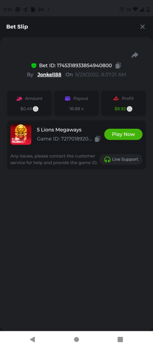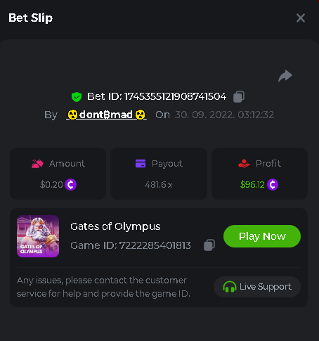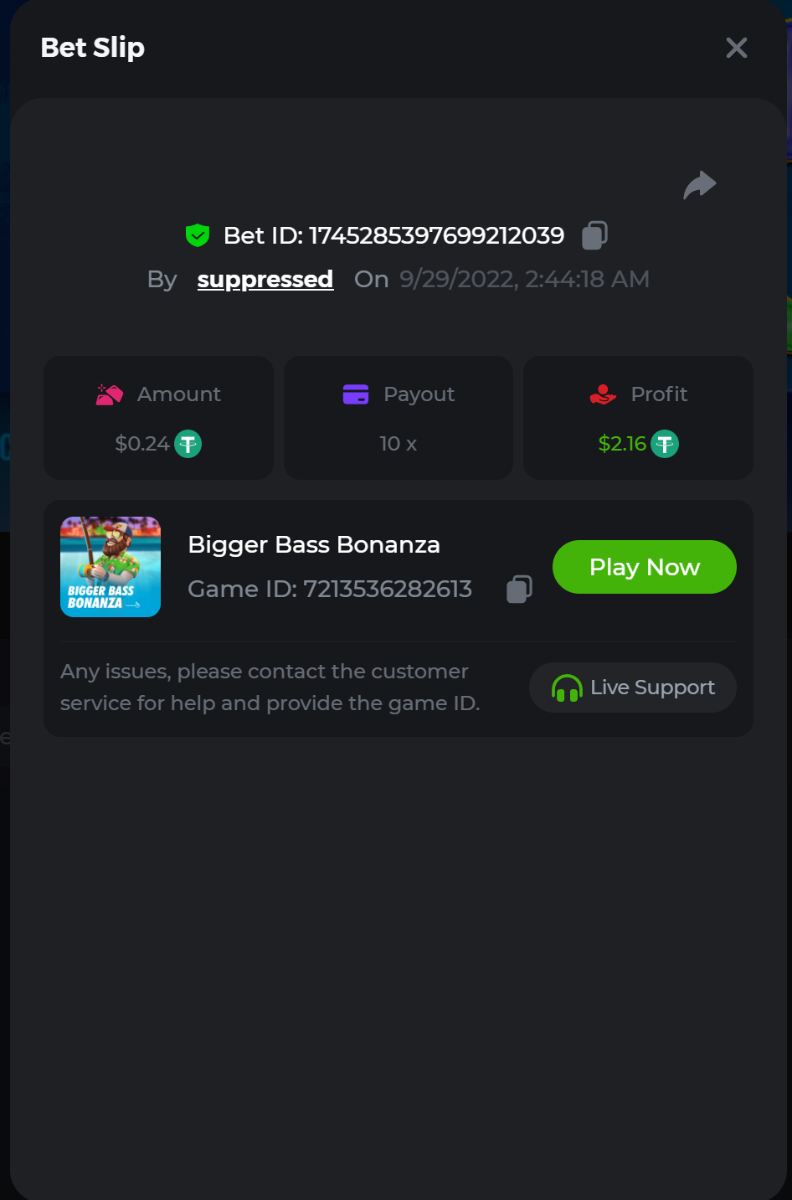 • 같은 게시물 에서 게임 ID WITH VIEW IN USD mode ENABLED를 클릭하여 승리 스크린샷을 업로드합니다 . 내기는 실제로 배치 당시의 최소 요구 사항을 충족했습니다.