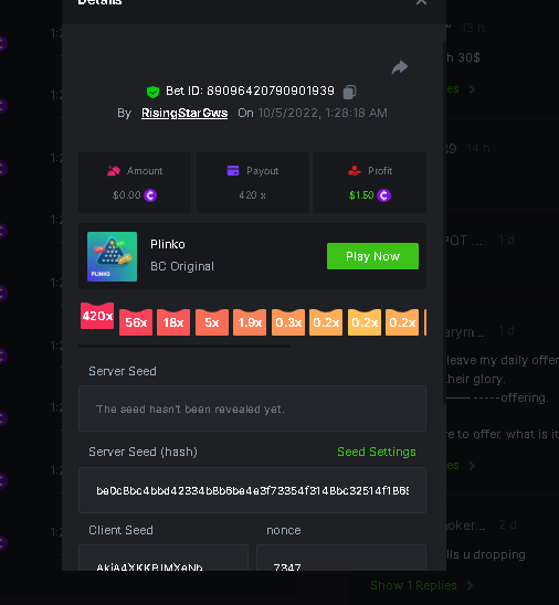 Black Tiger Posted October 4, 2022 Share Posted October 4, 2022 Read Carefully Before Start To Hunt Daily Challenges #33: PLINKOHunt :Win the highest pay outMin Payout requirement 100xMin Level 4️Duration Starting : Now End time : 23.59 UTC Time How to Join? Only Post on BC.Game Telegram Official HERE Make screenshot + paste your bet link + UID or profile link To get bet link can check HERE Any coin allowedReward Prizes 1st Place....... $7 BCD2nd Place..... $5 BCD3rd Place...... $4 BCD 🎖4th Place......$3 BCD5th - 10th Place......$1 BCD 🏵 Winners will be announcing next day after Roll Point Link to comment Share on other sites More sharing options...