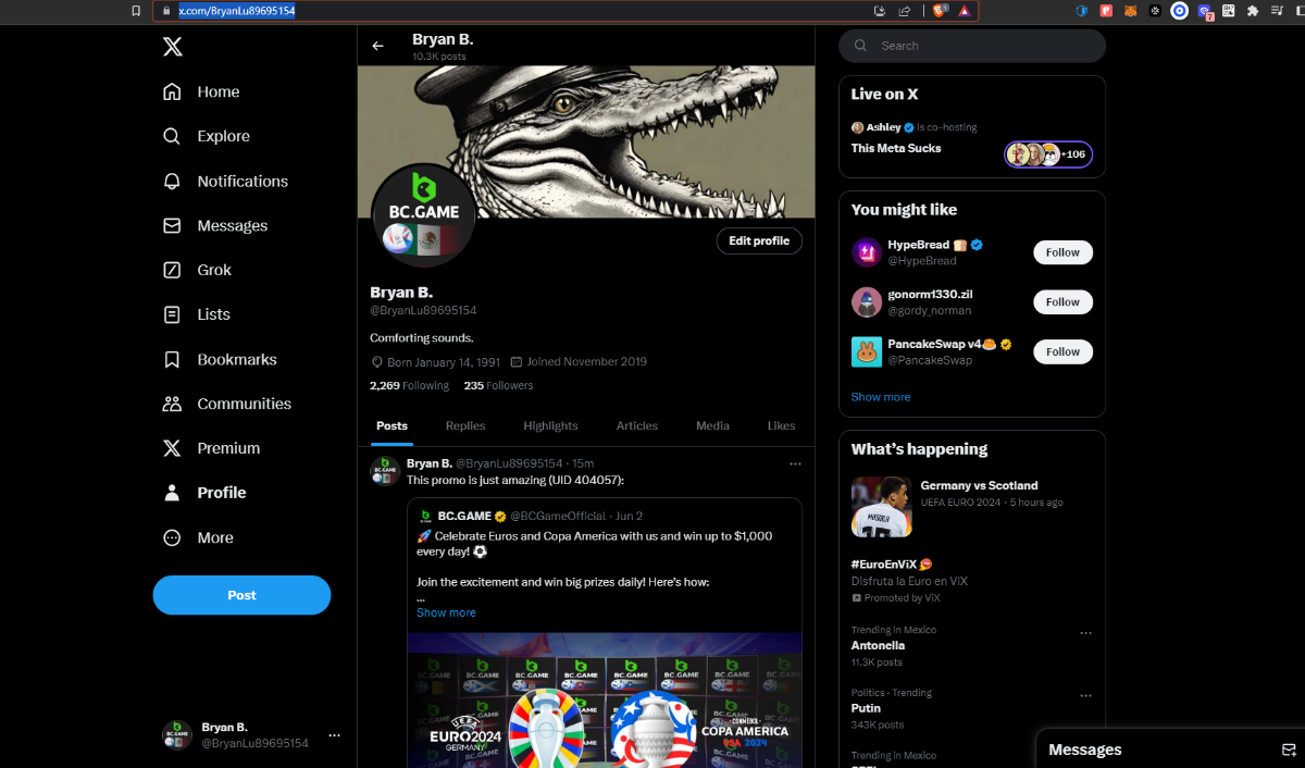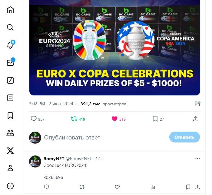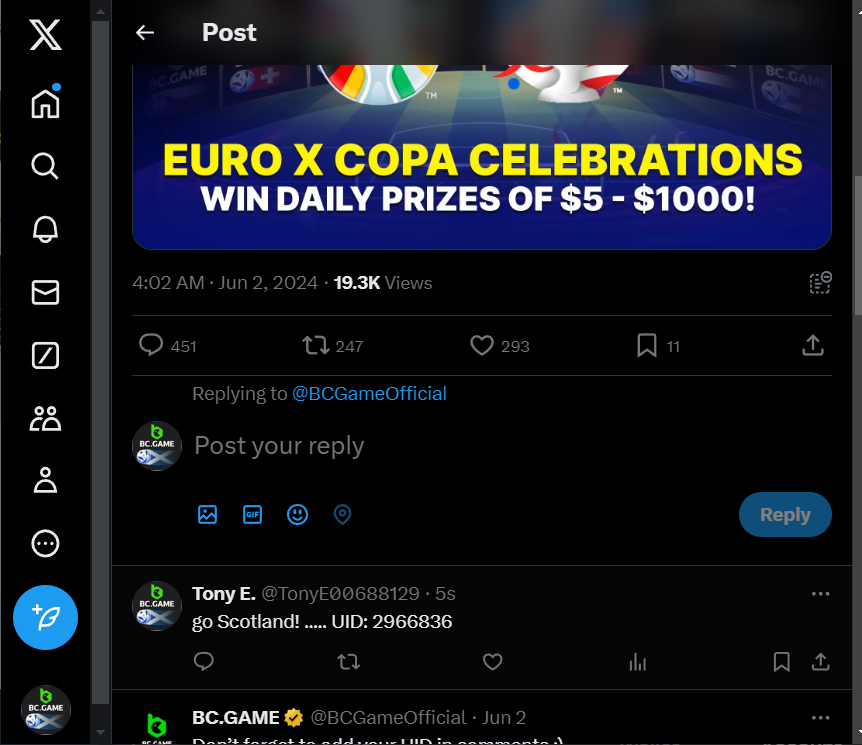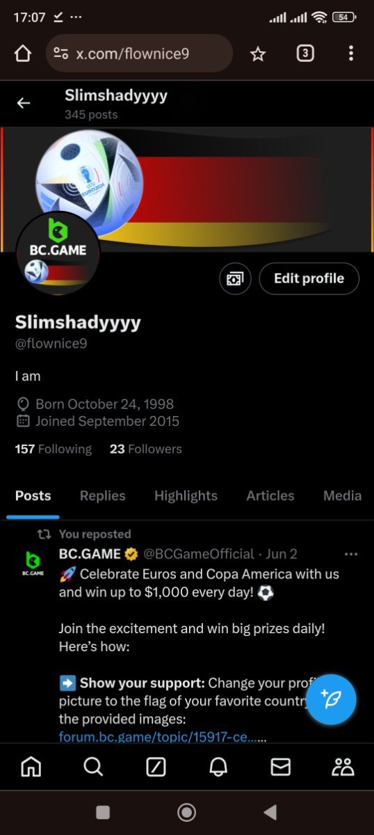 SimOnS Posted June 19, 2024 Share Posted June 19, 2024 On 6/1/2024 at 7:56 PM, BCGame_Maxim said: Celebrate Euros and Copa America with Us! ️ Duration: 1st JUNE to 30th JUNE Join the excitement of Euros and Copa America with us and stand a chance to win big prizes daily! How to Participate: 1. Show Your Support Change your profile picture to the flag of the country you support on your twitter handle from our following images. Comment your User ID on our X post here: https://x.com/BCGameOfficial/status/1797207266468495856 2. Engage and Win Engage with our posts on X (formerly Twitter) to enter daily prize draws. Each Prize range from $5 to $1000 every day for random participants! 3. Special Event - The Euro Cup 2024 Participate in our exclusive Euro Cup 2024 event. Find all the details here https://bc.game/events/home Don't miss out on the fun and the chance to win fantastic prizes. Show your team spirit, engage with our community, and win daily! IMAGES TO CHANGE ON YOUR X PROFILE (Click on any images below to expand or right click to save) Euros 2024 Group AGermany Scotland Hungary Switzerland Euros 2024 Group BSpain Croatia Italy Albania Euros 2024 Group CSlovenia Denmark Serbia England Euros 2024 Group DPoland Netherlands Austria France Euros 2024 Group EBelgium Slovakia Romania Ukraine Euros 2024 Group FTurkey Georgia Portugal Czechia Copa America 2024 Group AArgentina Peru Chile Canada Copa America 2024 Group BMexico Ecuador Venezuela Jamaica Copa America 2024 Group CUSA Uruguay Panama Bolivia Copa America 2024 Group DBrazil Colombia Paraguay Costa Rica Let's celebrate together and make this a memorable tournament season! Changed avatar Link to comment Share on other sites More sharing options...