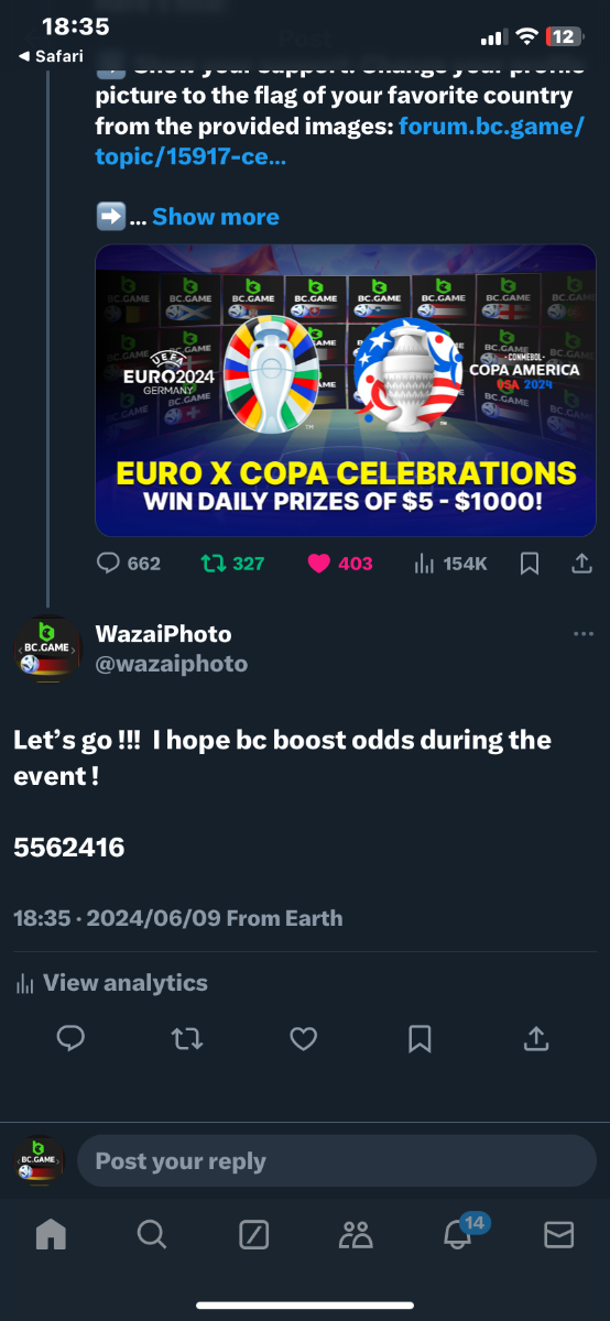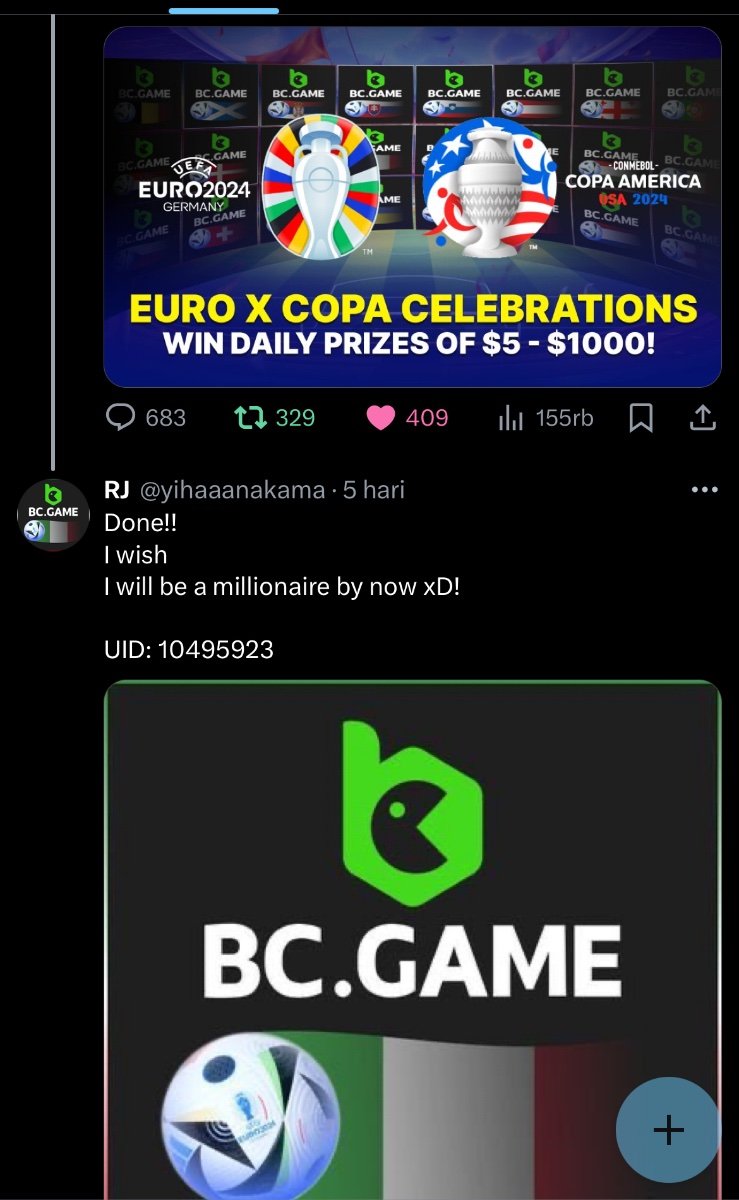 Kiaraaa Posted June 19, 2024 Share Posted June 19, 2024 On 6/1/2024 at 11:26 PM, BCGame_Maxim said: Celebrate Euros and Copa America with Us! ️ Duration: 1st JUNE to 30th JUNE Join the excitement of Euros and Copa America with us and stand a chance to win big prizes daily! How to Participate: 1. Show Your Support Change your profile picture to the flag of the country you support on your twitter handle from our following images. Comment your User ID on our X post here: https://x.com/BCGameOfficial/status/1797207266468495856 2. Engage and Win Engage with our posts on X (formerly Twitter) to enter daily prize draws. Each Prize range from $5 to $1000 every day for random participants! 3. Special Event - The Euro Cup 2024 Participate in our exclusive Euro Cup 2024 event. Find all the details here https://bc.game/events/home Don't miss out on the fun and the chance to win fantastic prizes. Show your team spirit, engage with our community, and win daily! IMAGES TO CHANGE ON YOUR X PROFILE (Click on any images below to expand or right click to save) Euros 2024 Group AGermany Scotland Hungary Switzerland Euros 2024 Group BSpain Croatia Italy Albania Euros 2024 Group CSlovenia Denmark Serbia England Euros 2024 Group DPoland Netherlands Austria France Euros 2024 Group EBelgium Slovakia Romania Ukraine Euros 2024 Group FTurkey Georgia Portugal Czechia Copa America 2024 Group AArgentina Peru Chile Canada Copa America 2024 Group BMexico Ecuador Venezuela Jamaica Copa America 2024 Group CUSA Uruguay Panama Bolivia Copa America 2024 Group DBrazil Colombia Paraguay Costa Rica Let's celebrate together and make this a memorable tournament season! 6178260 https://x.com/BCGameOfficial/status/1797207266468495856 Link to comment Share on other sites More sharing options...