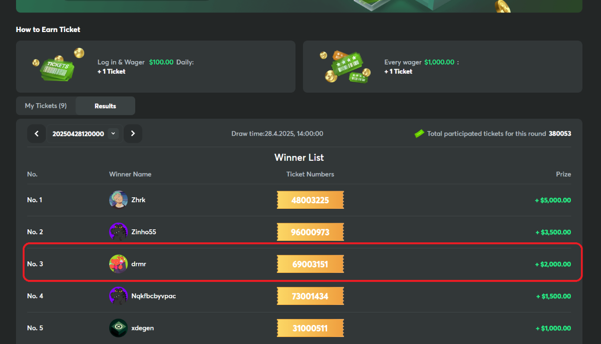 -Won the Weekly Raffle 2000$ as 3RD Place