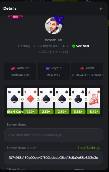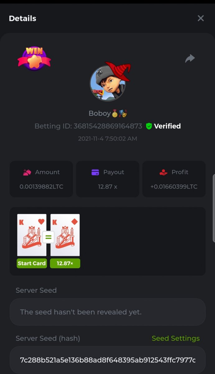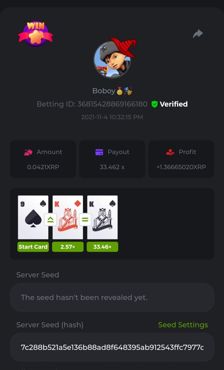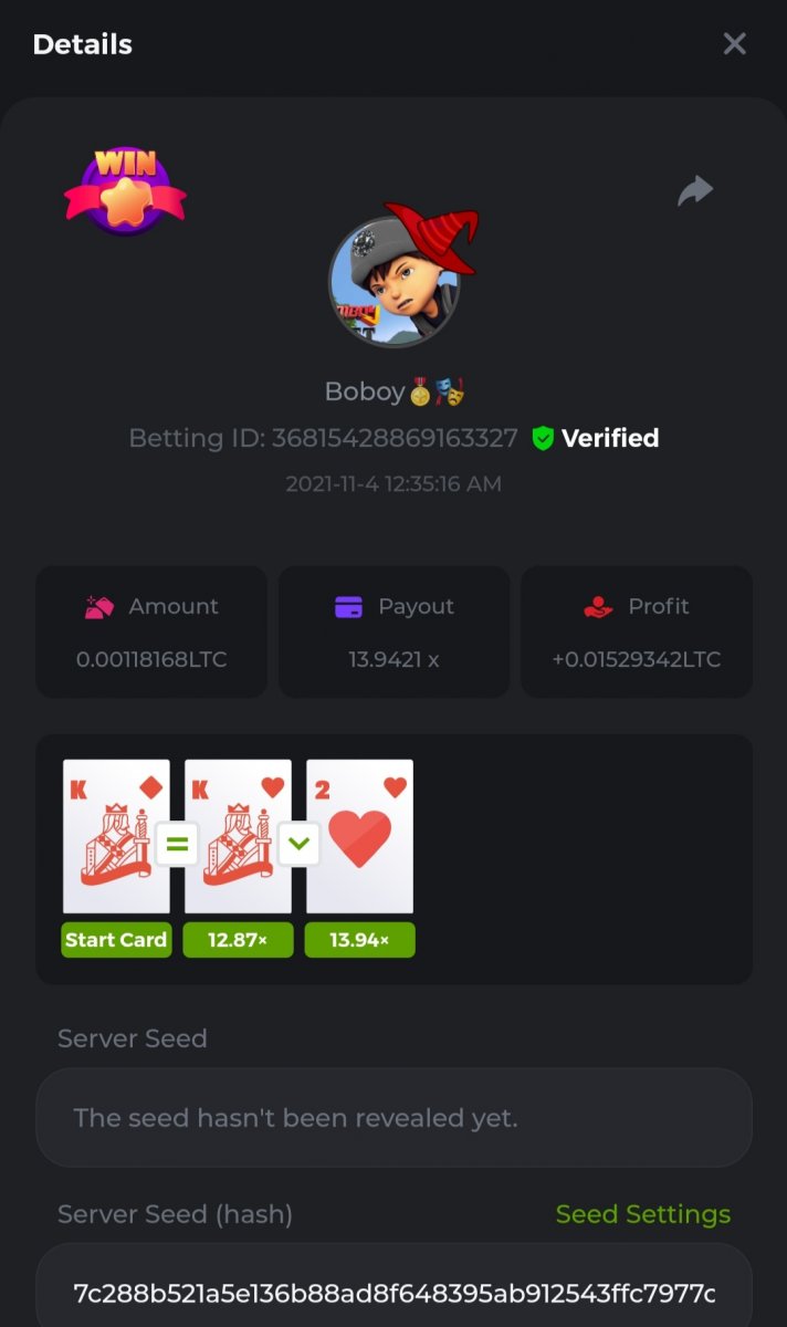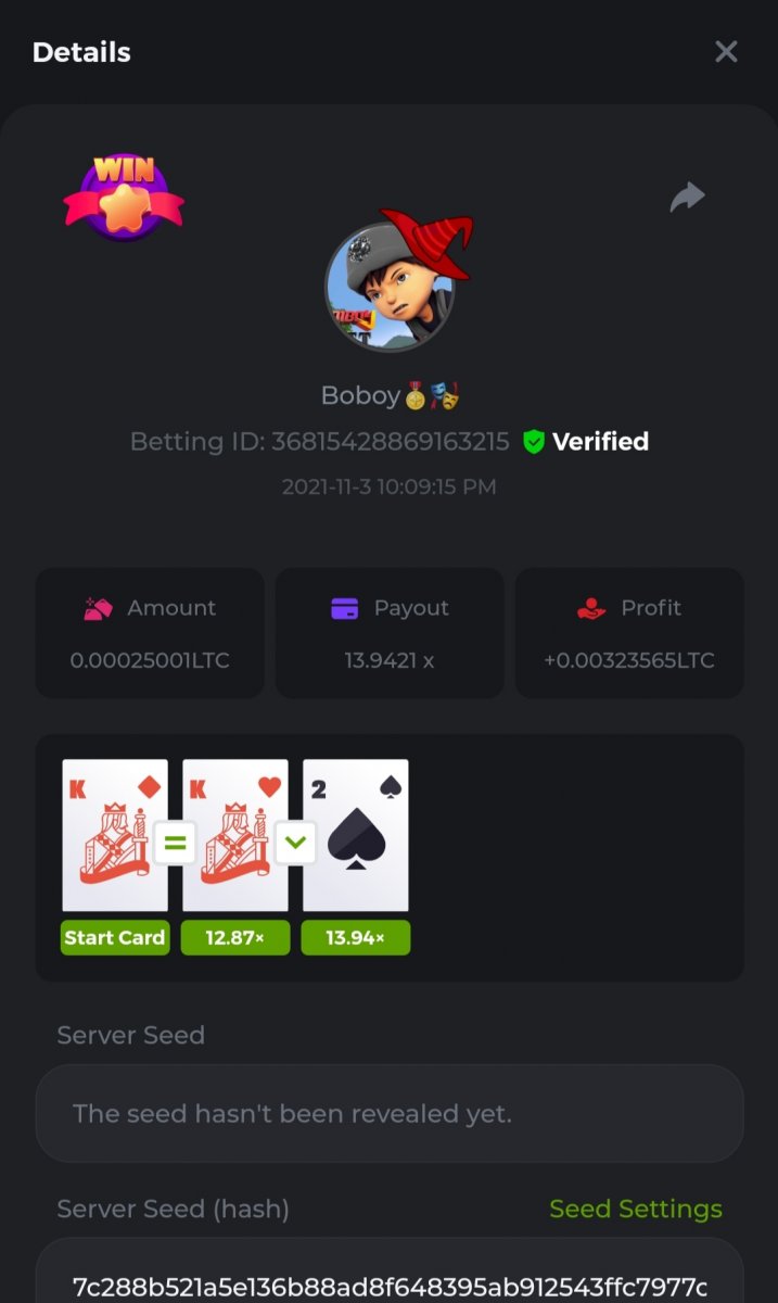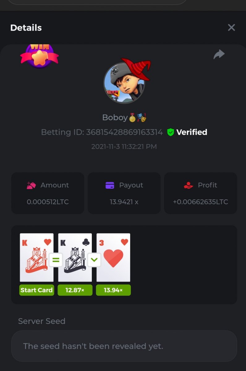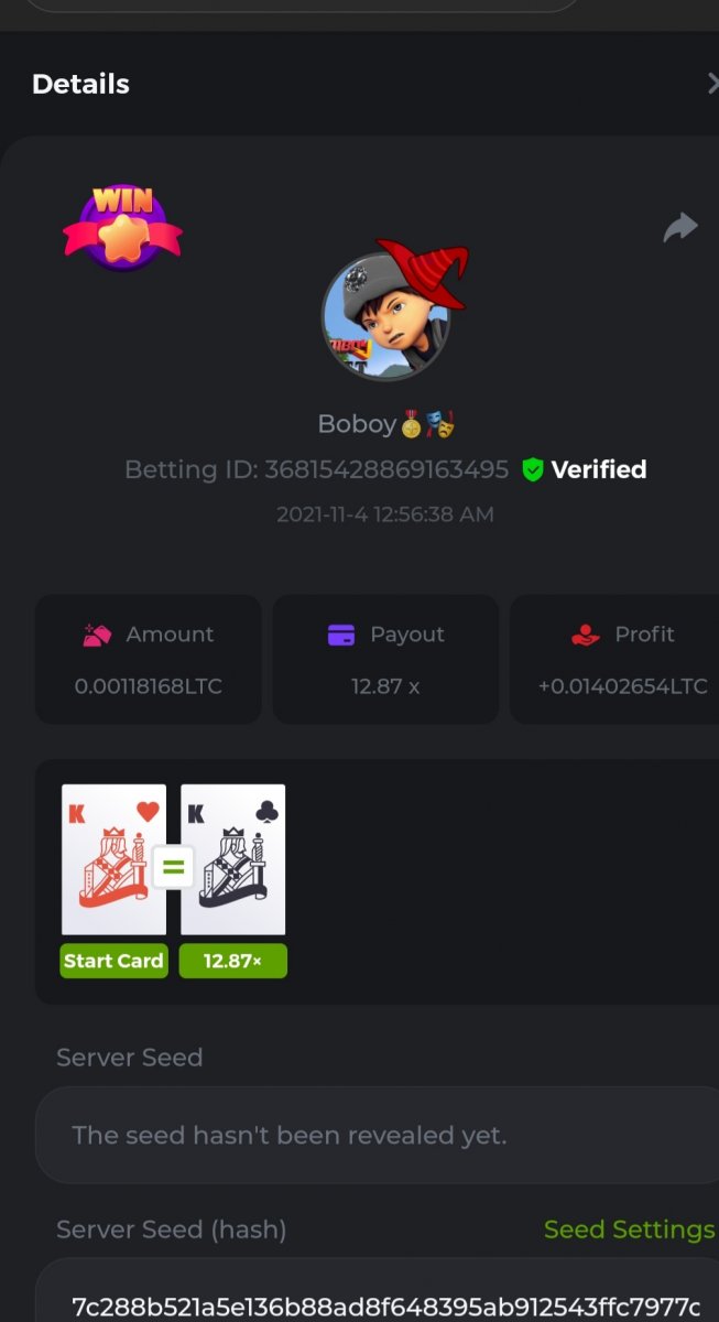 WOUNDED Posted November 3, 2021 Share Posted November 3, 2021 Small challenge #4 Every week,along to the prestige & top challenge,we have a side challenge for you We have considered HILO game for this week (We have prepared a special option Whoever earns more points this month،will receive a $ 20 prize at the end of the month) First place Second place Third place Starts: 21:00, November 3 GMT Ends: 21:00, November 6 GMT What's the Challenge? Earn 2 king cards in a row Minimum VIP Tier Must be VIP4 or higher in order to enter this challenge. Minimum Bet Size $0.05 USD equivalent (please check the individual coin amounts below) - Bets made below this amount will not count Eligible Coins All coins are eligible (excluding JB) Available Prizes 1......$20 2......$15 3......$10 To enter,copy the bet ID of the bet you'd Once you've copied it,post it as a reply to this thread like so: Betting ID:39689264501358651 In the same post,upload a screenshot of your win by clicking the game ID WITH VIEW IN USD mode ENABLED (accessible at the bottom of dropdown menu for your wallet up top.this way,we can ensure that your bet indeed met the minimum requirement at the time of placing it The one with the highest base amount wins In a tie,the one who submits the bet faster will be declared the winner Bets must be posted within 24 hours of placing bet in order to keep things fair for everyone Bets must be made during the specified time window stated above. This thread will lock automatically when the time period is over Each user is only allowed with one account Otherwise,the wrongdoer will be dealt with Failure to follow instructions will result in your submission being null and void Payouts will be made within 24 hours of challenge completion,please be patient Let's goGood luck Betting ID:39689264501358651 Link to comment Share on other sites More sharing options...